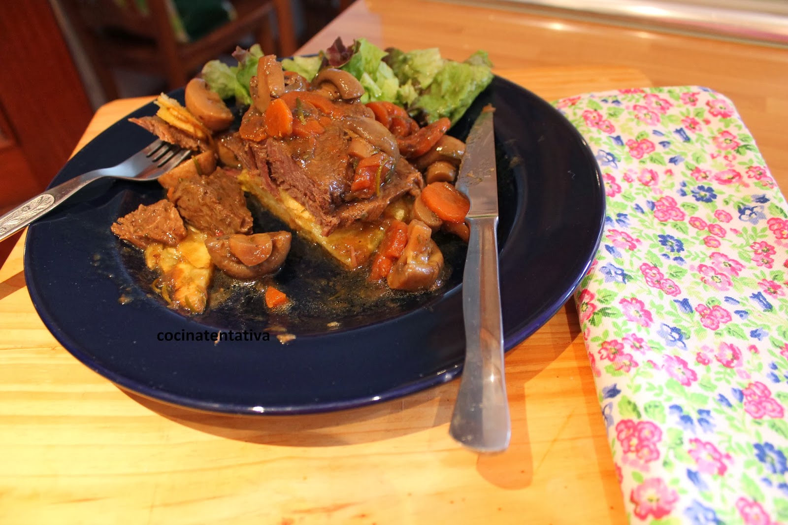 Yo he puesto el emplatado en un aro, poniendo 1º las patatas, después la carne y por último la guarnición de verduras, también he puesto una ensalada de lechuga para que fuera más vistoso y completo.